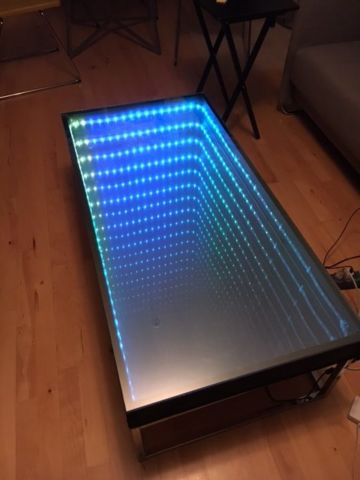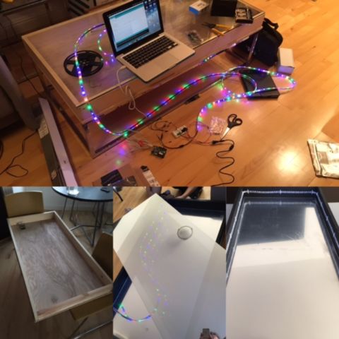 Late last year, my friends and I went out to Audio, this club in SF. I was just entranced by the infinity mirror behind the DJ booth and became determined to make my own. I completed it in two major steps—first was the physical construction with basic light patterns, and second came the addition of a microphone for sound-reactivity.
